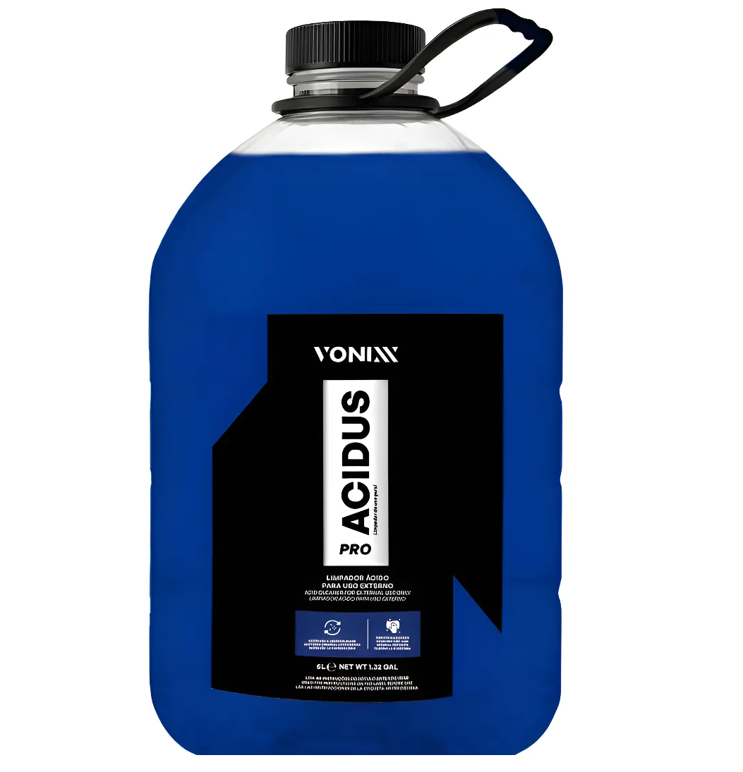 Indicado para a limpeza profunda de rodas, chassis, emblemas, plásticos externos, metais e superfícies pintadas, o ACIDUS PRO atua dissolvendo resíduos minerais, poeira de freio, calcificações e manchas causadas por água dura. O produto é altamente eficaz na remoção de marcas d’água leves em vidros e pinturas, ajudando a restaurar o aspecto original e o brilho das superfícies tratadas.