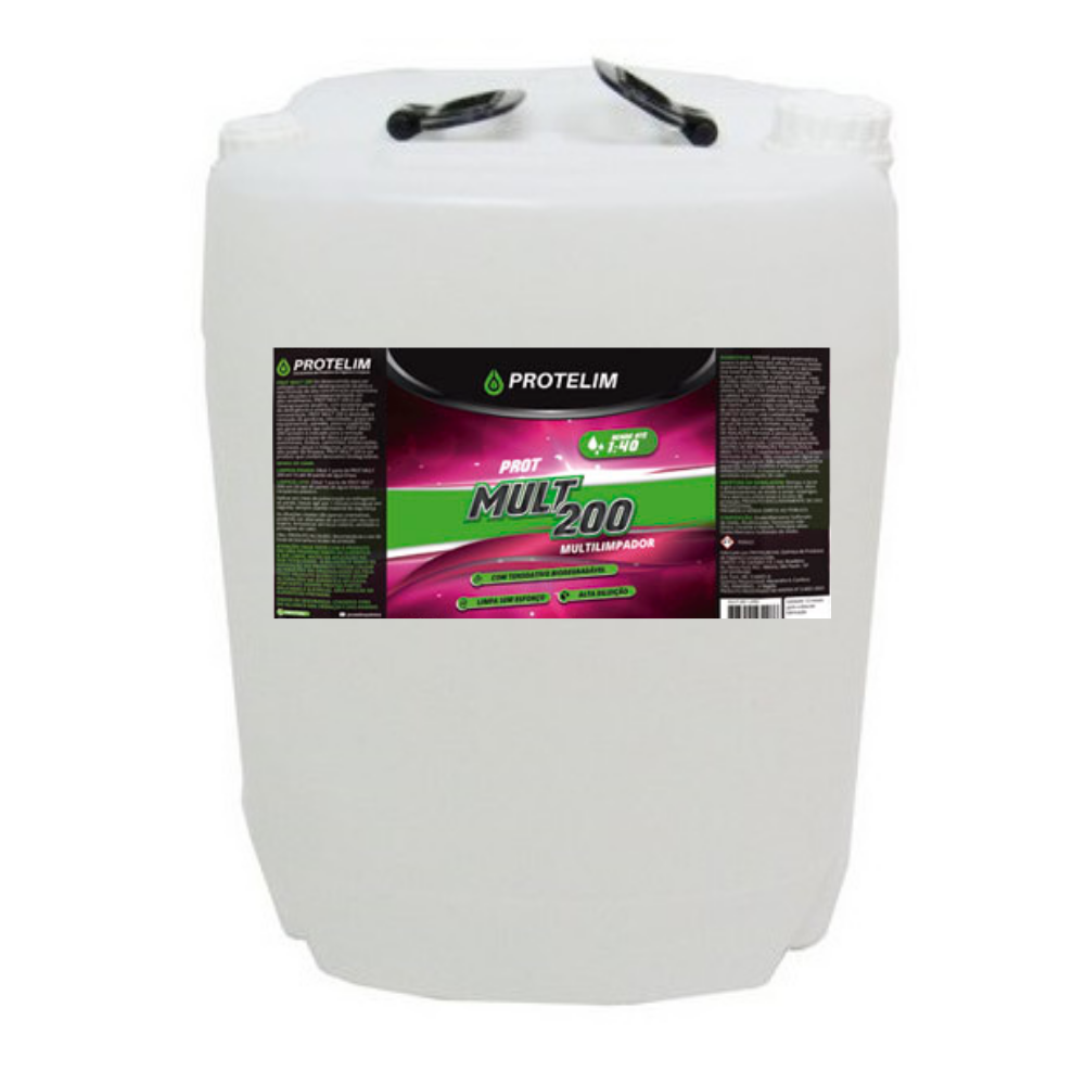 PROT MULT 200 é um produto que contém Tensoativo biodegradável. Foi desenvolvido para ser utilizado como um Desengraxante multiuso alcalino e sua fórmula de alta concentração proporciona altas diluições e, consequentemente, um alto rendimento. Com excelente poder de detergência e umectação devido à alta concentração, é destinado à remoção de gorduras, oleosidades, graxa em equipamentos, paredes, pisos e superfícies em geral dentro das indústrias, automóveis, ônibus, caminhões, embarcações, aeronaves, peças e máquinas, proporcionando alto poder de limpeza.