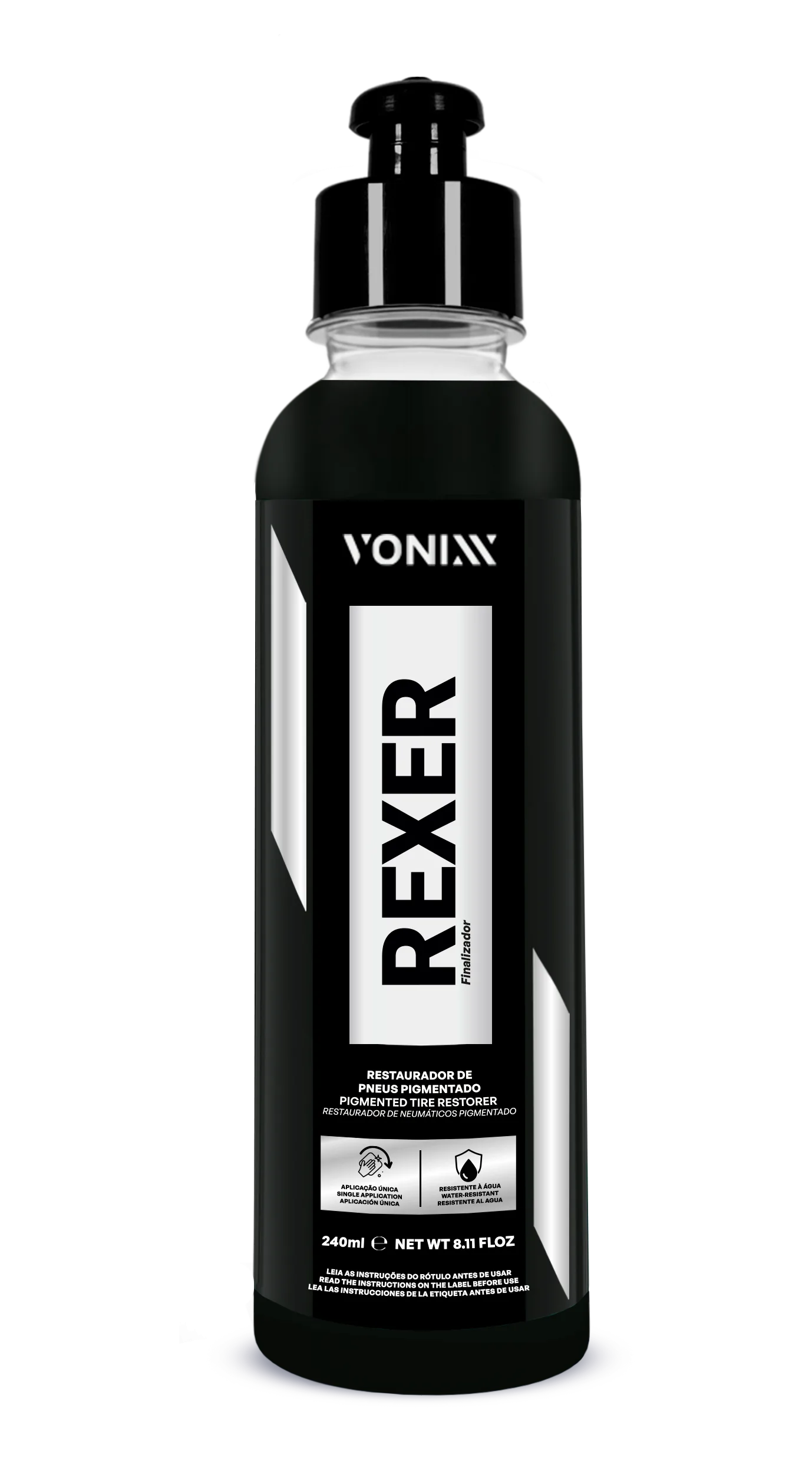 REXER é um restaurador de pneus pigmentado, de alta durabilidade, que forma um filme seco, brilhante e resistente à água em uma única aplicação.